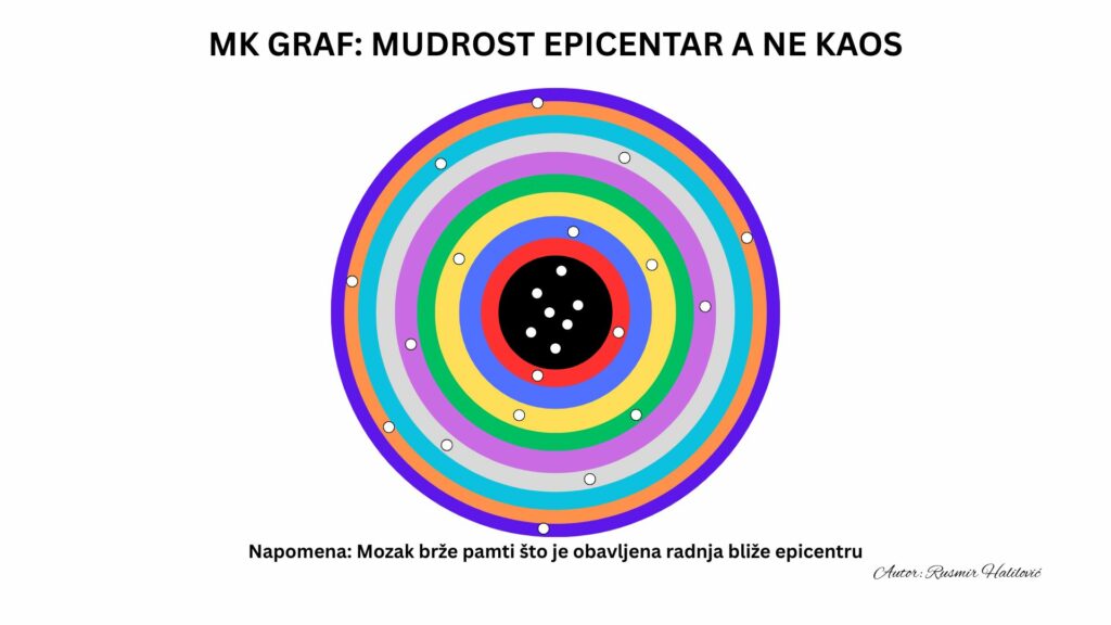 „Produktivna visoka tehnologija otvaranja „fajlova“ u mozgu koji se brže formiraju što je obavljena radnja bliže centru. Unaprijed zacrtano vrijeme do perfekcije se kontrolira MK mjernim jedinicama, a ispravlja i ubrzava novim detaljima, a korigira promjenom metodike. „Ponavljanje je majka učenja“, ali kakvo, kad i zašto u tome je poanta, naravno i koliko pedagoga puni mozak jednog košarkaša u istom vremenu, što se logički može vidjeti na grafu! Punjenje epicentra puno će biti uspješnije, a rezultati neusporedivo bolji i brži ako ga radi jedan MK specijalista nego više trenera, kad nastaje kaos!“